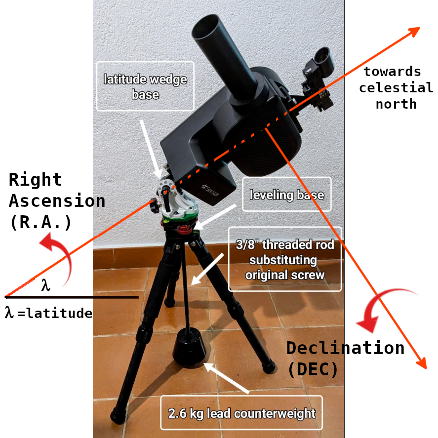 The artifact that enables us to mitigate the Earth's rotation effect is the equatorial mount. This mount allows the telescope to be oriented toward celestial north (or south, if we are in the Southern Hemisphere). The axis pointing toward celestial north or south (the right ascension axis) remains parallel to the Earth's axis of rotation. The second axis, the declination axis, is perpendicular to the former.