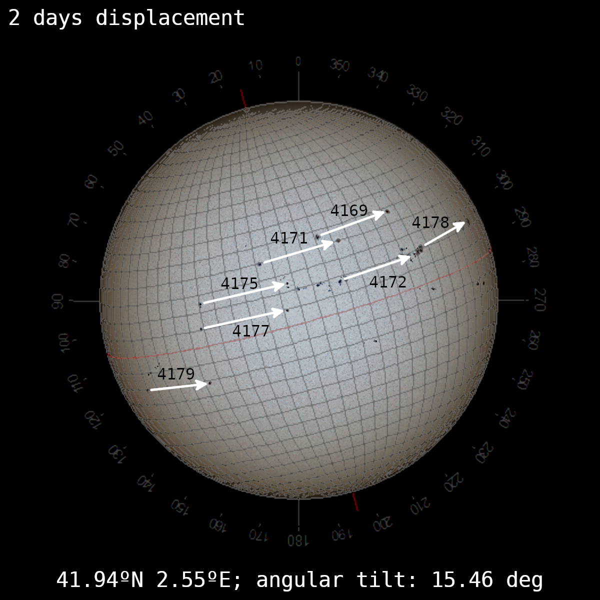 We can try to plot a spherical grid adapted to the displacement lines that are shown in the right plot of Figure 8. However, there is a program (sorry, only available for Windows systems) that can help us a lot: TiltingSun. Introducing our latitude, longitude, date, and time, it shows the orientation of the Sun. In our case, it provides a value of 15.46° for the angular tilt and a latitude of 6.55° for the center of the visible Sun. Figure 9 is the result of superimposing the 5° resolution grid provided by the program on the 2-day displacement plot.