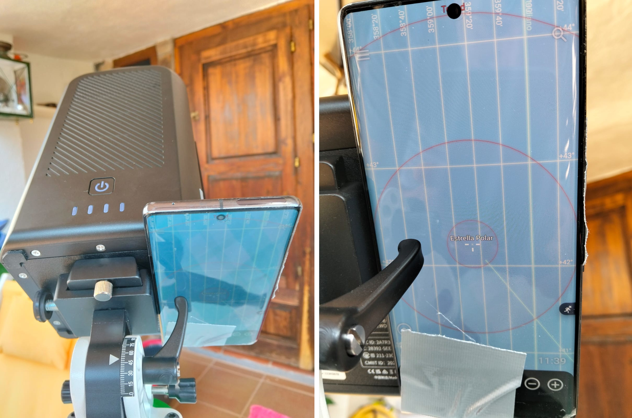Method 2.- The second method involves smartphone apps like Stellarium that provide the position of the stars in real time. This method (Figure 6) involves placing your smartphone perpendicular to the RA axis to search for Polaris (the North Star). Note that, like the previous method, this method can also be used in the southern hemisphere because such programs can be used to find the celestial north or south.