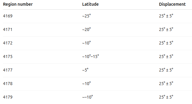 First, we should mention that the Sun's rotation period depends on latitude because it is not a rigid solid. To obtain a more accurate value, we should get more measurements and have more variety in the latitude of the sunspots. The latitudinal distribution of the sunspots depends on the time inside the 11-year solar cycle. However, sunspots rarely appear beyond 40° latitude (Ian Ridpath & Wil Tiriton Guide to stars and planets, Ed. Collins and Sons, London 1984, also in Spanish).